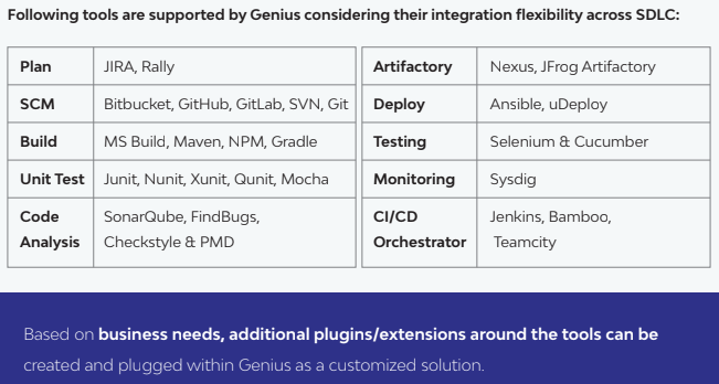 • LTM’s Genius Platform is geared particularly towards re-imagining DevOps Transformation journey by addressing typical enterprise challenges. Genius is a comprehensive suite of accelerators which comprises of a DevOps maturity assessment framework, end-to-end automation, & insights across DevOps lifecycle.