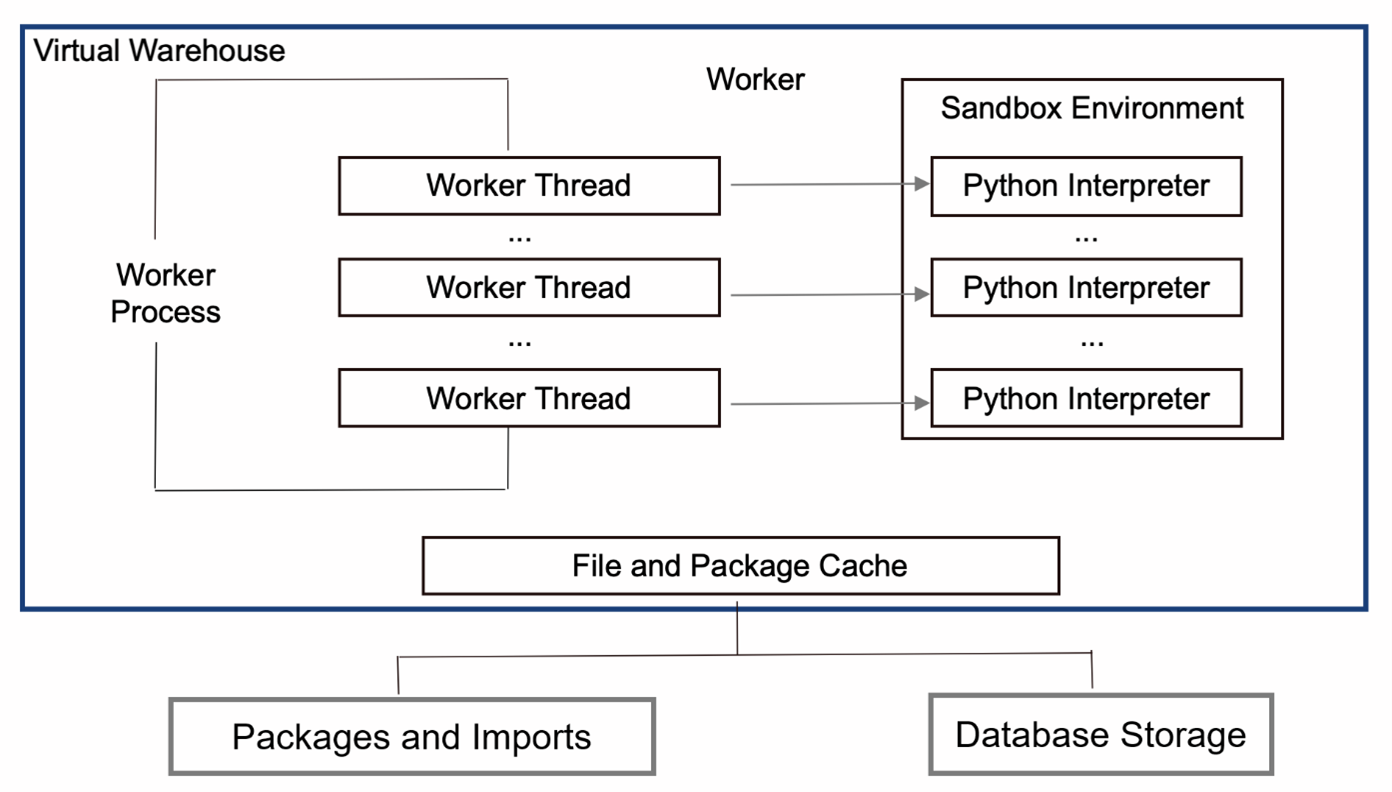 - After the Python interpreter initialization, Snowflake forks additional processes to execute the Python function. This approach reduces the time required to initialize the interpreter for each function's execution.