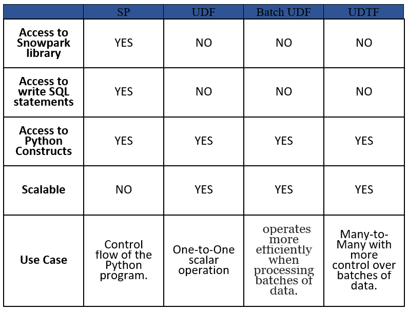 Once the UDTF execution is complete on each node, the intermediate results are combined or merged to produce the final output. Snowflake handles this merging process transparently, providing a unified result set to the query. By leveraging the distributed computing capabilities of the Snowflake data warehouse, UD(T)Fs provide a scalable and performant solution to the SPs problem. They allow for the efficient utilization of multiple nodes and enable parallel processing, thereby overcoming the limitations of executing code on a single node.