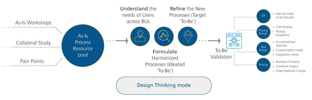 1. Studying the ‘As-Is' landscape - Here, the idea is to engage with clients in a workshop mode wherein the ‘As-Is' processes are explained per business process area by existing process owners or BU leads. Also, questionnaires customized towards the business context are populated through collaboration to record certain critical aspects across the business process spectrum in scope of the engagement. Any collaterals available with the client are shared and studied by the team of consultants. The outcome is developing a deep understanding of the needs from the user perspective across different business units (BUs).
