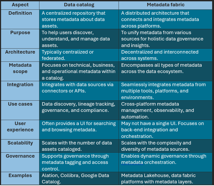 Table 1: Data catalog vs metadata fabric