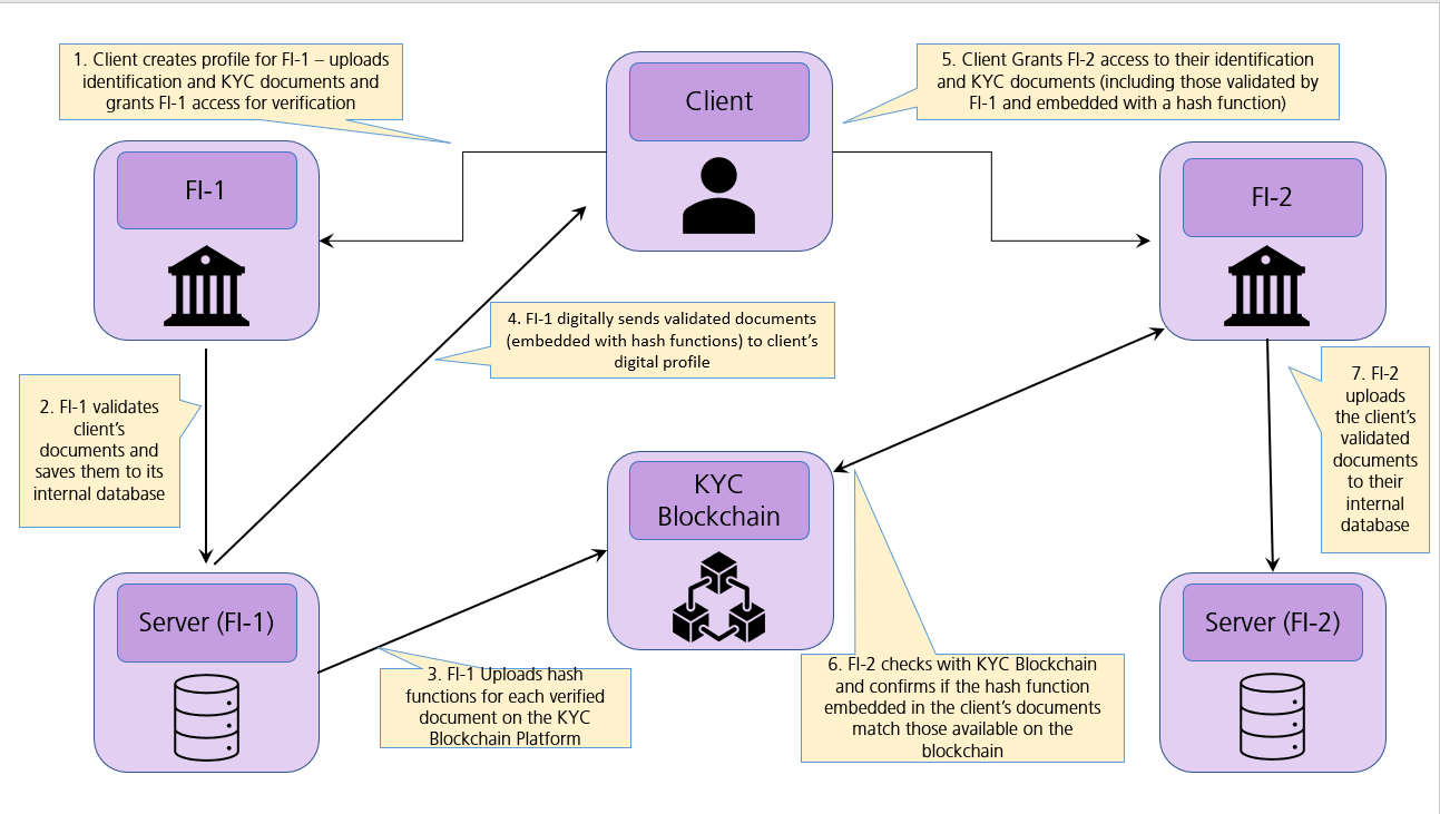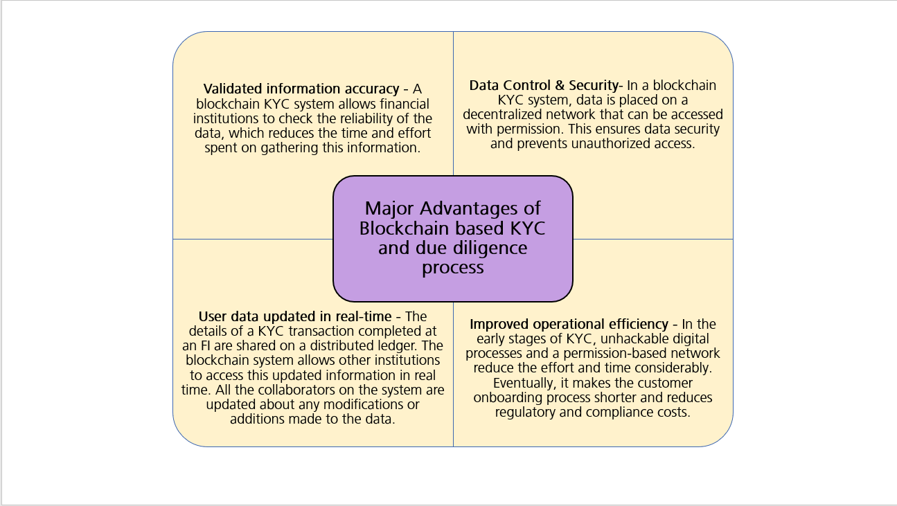 In a traditional KYC and due diligence system, each FI conducts a detailed identity check of its users through an individual organization or a government structure. However, this process requires significant time and effort. Blockchain is an emerging technology that is a decentralized ledger of all transactions across a peer-to-peer network. It is now being used in various industries to foster trust and transparency through indestructible authenticity. This allows the creation of a shared system in which users go through the KYC procedure to authenticate their identity only once. Other FIs or agencies working in collaboration can access the same data with the customer's permission. However, not all blockchain platforms are suitable for all purposes. As per research, distributed ledger technology (DLT), a private model seeking users' permission, is the most suitable for KYC processes.KYC process on the blockchain