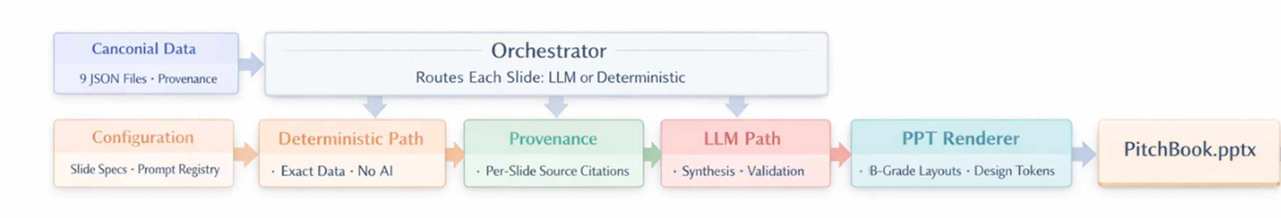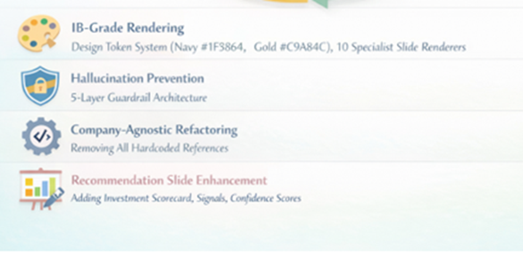 This project began with a simple premise: if a pitchbook is the most consequential artifact in investment banking, its creation should be just as deliberately design. By combining a Domain-First Architecture with the agentic capabilities of Google Antigravity, we have moved beyond “vibe coding” into a world where intelligence is reliable by construction.
