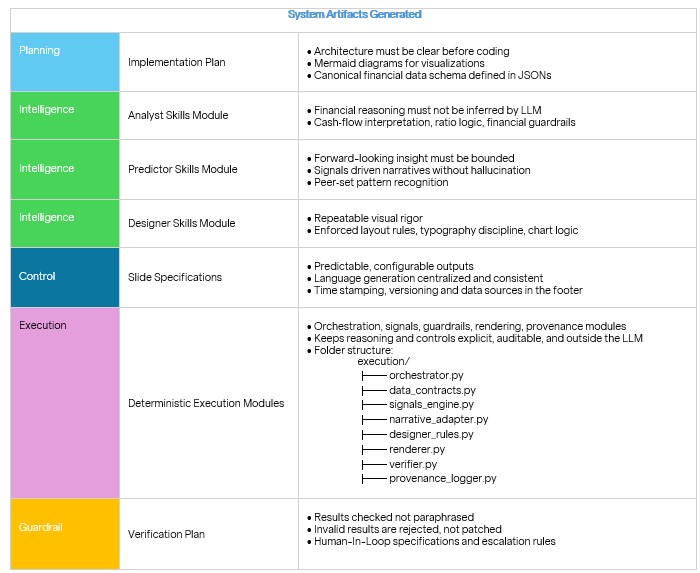 Iterative collaboration with the agentic builder, grounded in domain‑constrained prompting and stepwise planning, transformed intent into a system of artifacts, execution constructs, and guardrails.