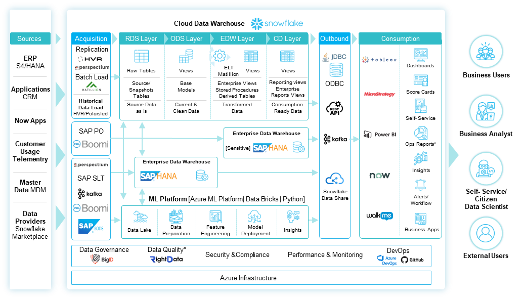 Consumption is another critical aspect that builds on the data obtained. Live dashboards, reports, and custom outbounds are three popular ways of consuming data. It's noteworthy that when the data consumption is not organized or curated, it results in many unusual reports, which can become cumbersome for the users. The "right fit" analytics platform will play a crucial role in the future. It favors frameworks and tools over purpose-built components, which ensures the scalability of the platform. It also favors managed services and platforms as a service (PaaS) as they address current limitations and pain points. This is because they are affordable to build and run, have a faster time to market, and can scale rapidly and cost-effectively to meet any new demand. Another significant aspect to consider is choosing the "right fit" partner for faster system integration. The partner should understand the organization's needs and objectives and recommend affordable and sustainable solutions. The partner chosen must also address current pain points as part of the proposal. The approach involves migrating all SAP objects to Snowflake-compatible objects and optimizing them to improve performance. The existing extracts are re-engineered and transformed for SAP BODS, Dell Boomi, to Matillion ingestion pipelines. This is carried out through a reusable/near-real-time ingestion framework. Near real-time replications of data are set up using HVR and Perspectium. The final step involves repointing Tableau, Power BI, MSTR, and BO reports to Snowflake. To carry out this transition, key considerations such as meeting data freshness SLAs and delivering acceptable performance must be considered. It is vital to eliminate any technical debts and rationalize the overall process for successful implementation. Furthermore, post-implementation support is essential to ensure the success of this process transition.