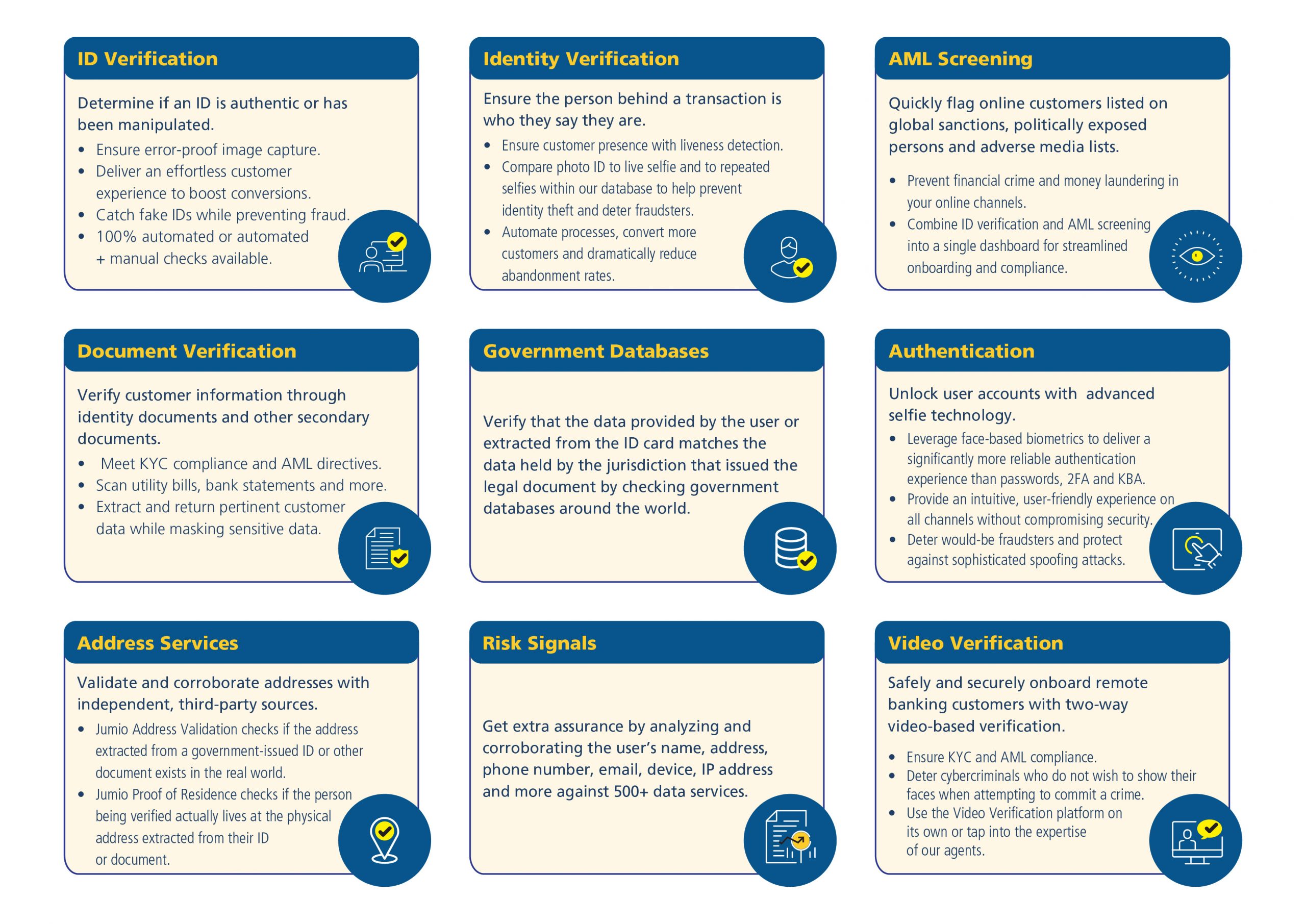 - More ID Types: With Jumio, you can access a broader range of identification types. Globally, Jumio offers support for more than 5,000 subtypes of IDs, including driver's licenses, passports, and ID cards.