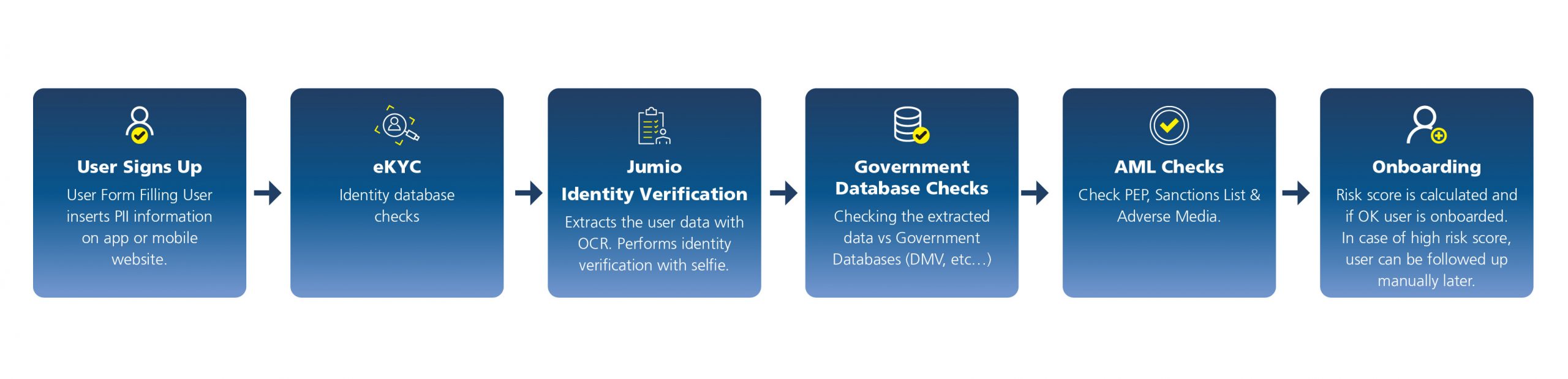 Jumio's identity verification and authentication platform can help streamline the customer onboarding process in several ways:- Speeding up the onboarding process: Quick and accurate verification of the identity of customers allows the onboarding process to be completed within minutes and not days using Jumio's identity verification.
