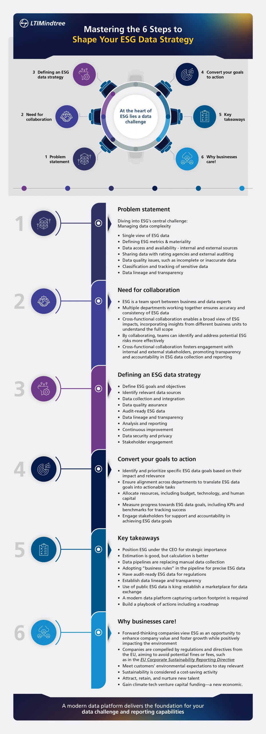 Here's an infographic that covers my insights in a nutshell on mastering the six steps to shape your ESG data strategy. Click here to download.