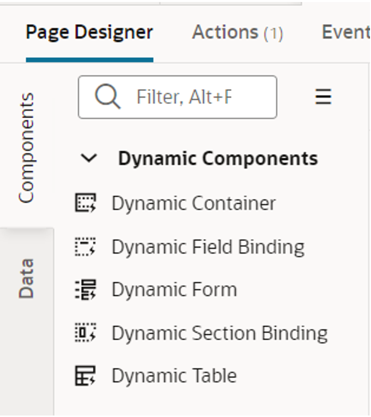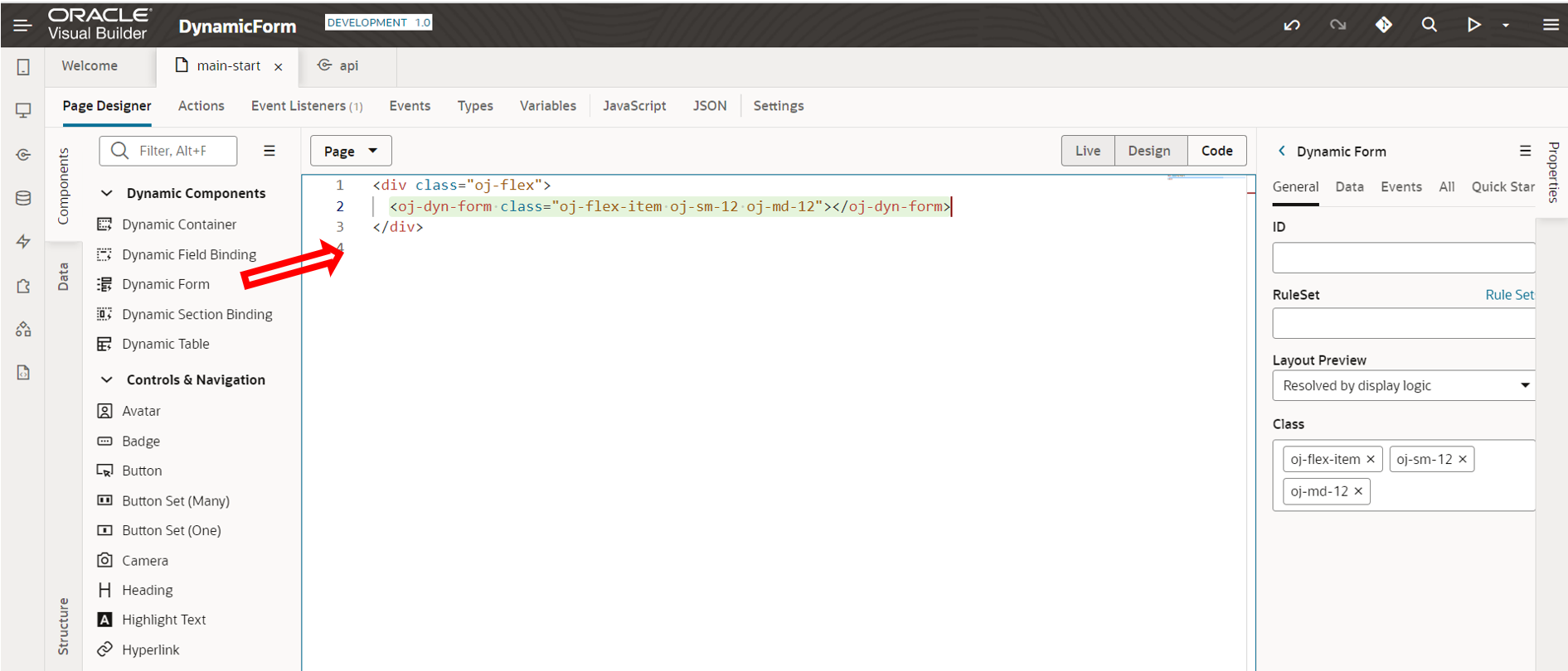 To achieve this in the Visual Builder Application, Oracle JavaScript Extension Toolkit's (Ojet) Dynamic Components are used. They are available in VBCS Page Designer Components under Dynamic Components.