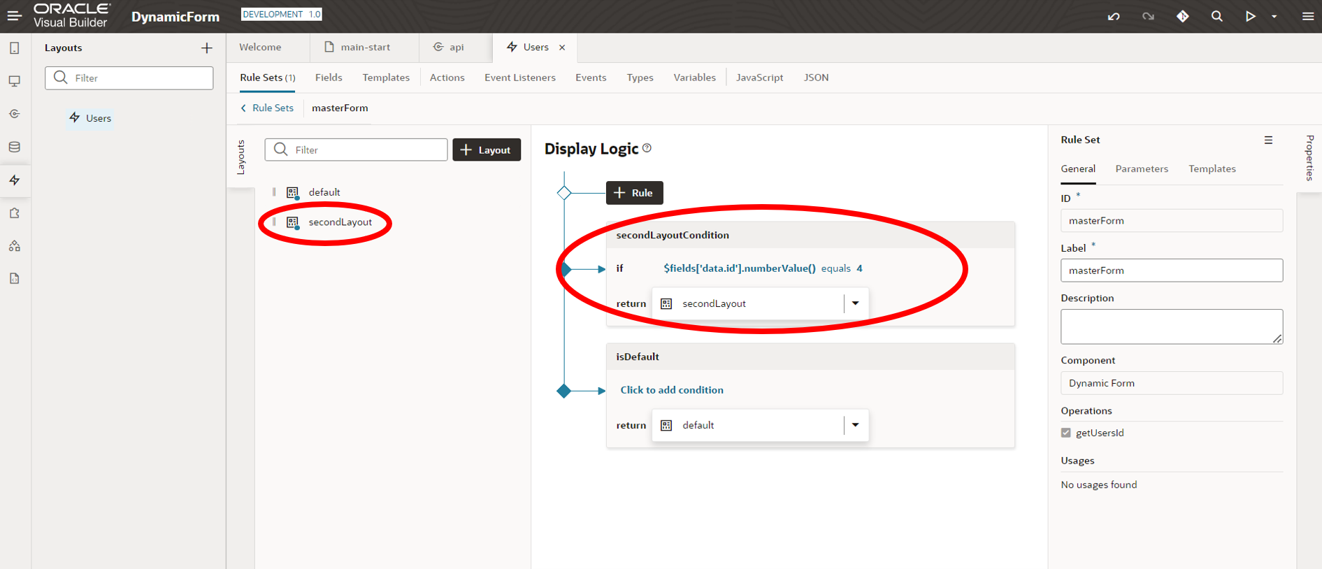 • Create a new layout, choose the fields to display, and then configure any other form properties you need. Next, add conditions to the rule set, so that the layout changes depending on the condition you specify. In this instance, I've made a second layout that will show only three fields and a rule set with conditional data. If the user enters "4" in the user id field, the second layout will be displayed; otherwise, the default layout will be shown. You may design a variety of layouts and situations and tailor your dynamic form to suit your user scenario.