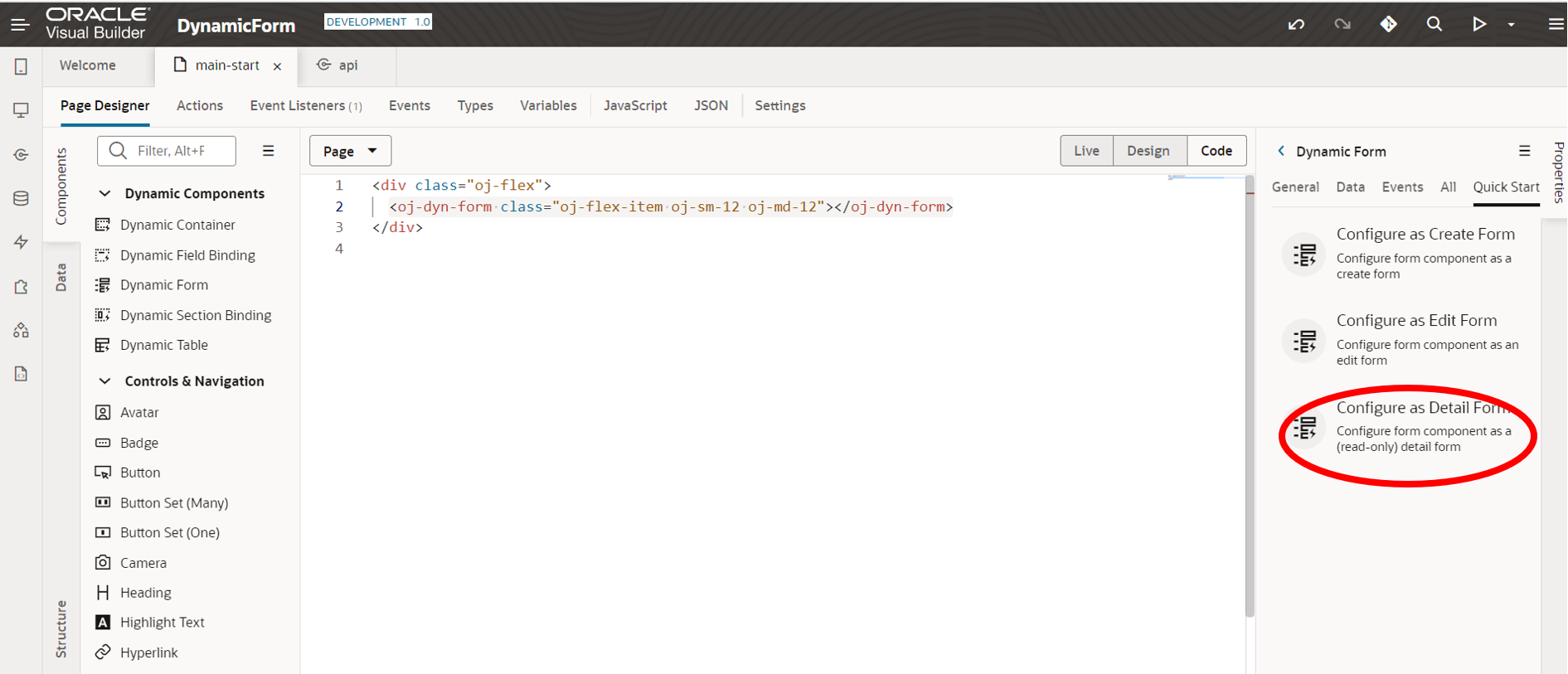 • Click on Configure a Detail Form after choosing Quick Start from the Properties menu (you can click other options based on your need)