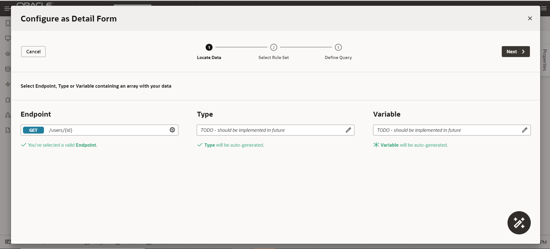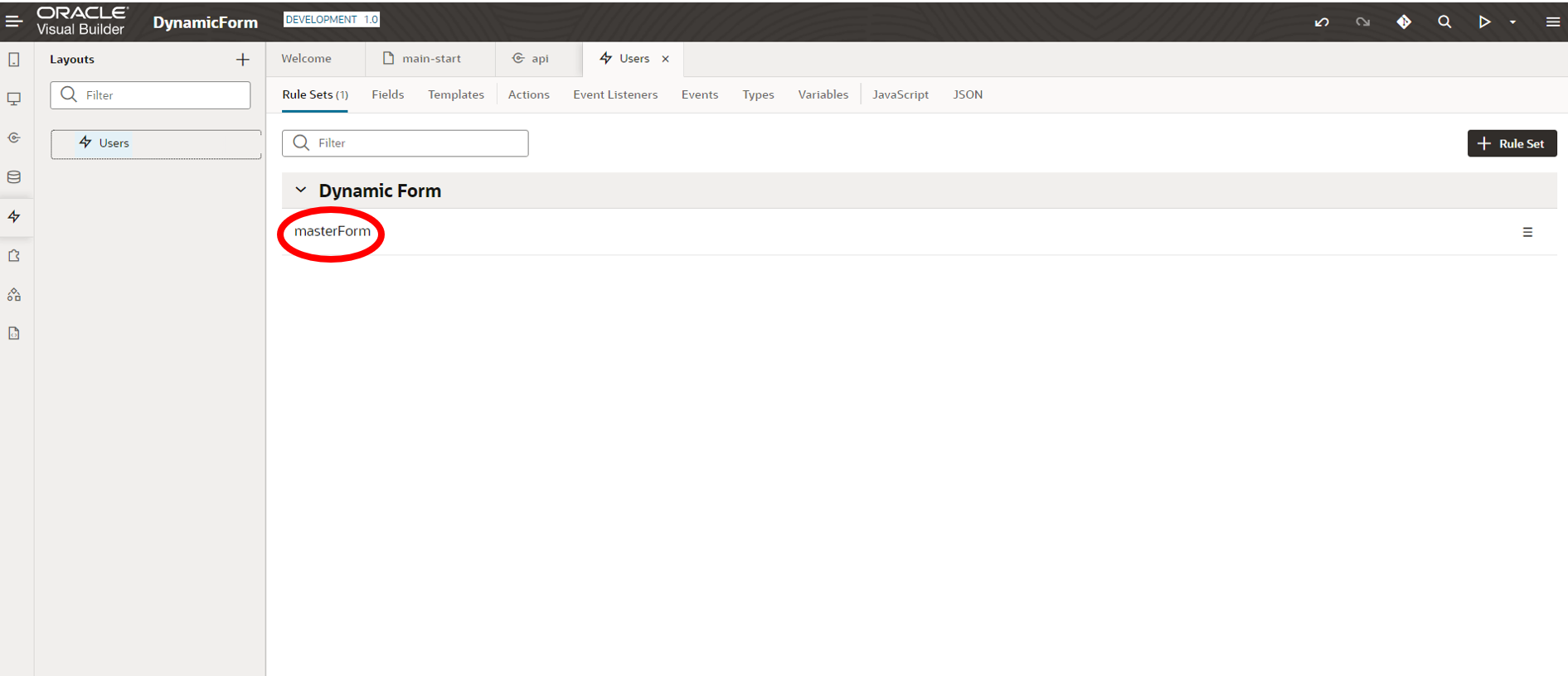 With an action chain to fetch and load data into the variables, VBCS will automatically generate the types and variables needed for the dynamic form. These can be altered depending on your use case.