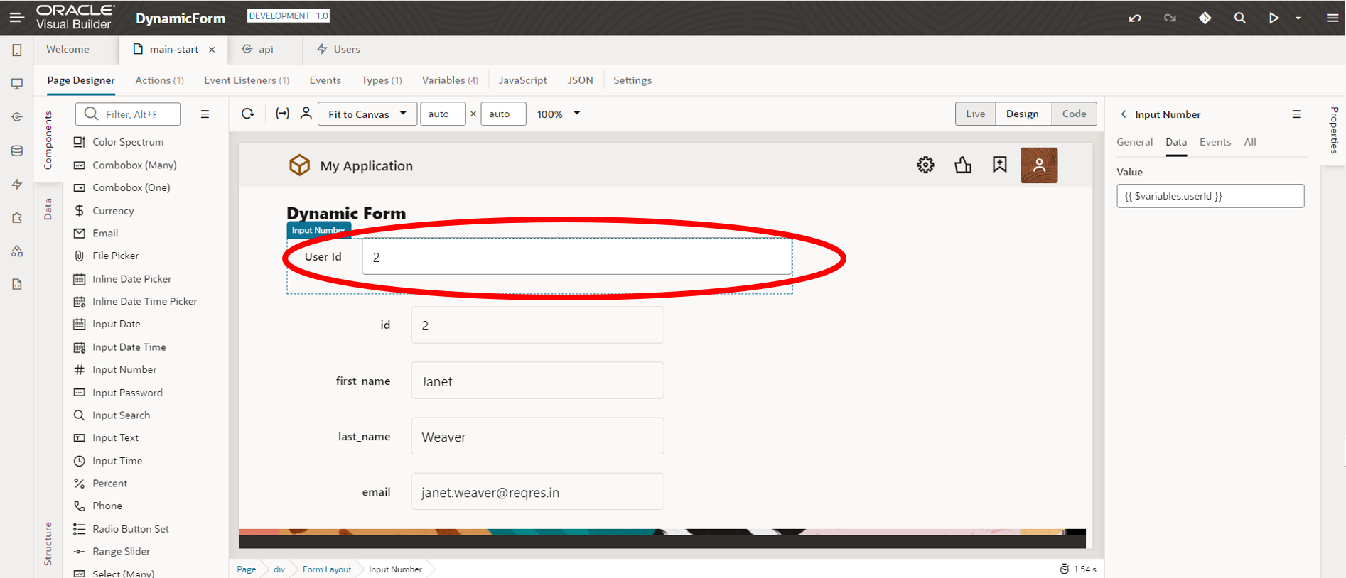 To take inputs from the user I have created an input field i.e., User Id, and mapped that value to the API rest call query parameter in the action chain created to load data in dynamic form.   Customize layout for dynamic form