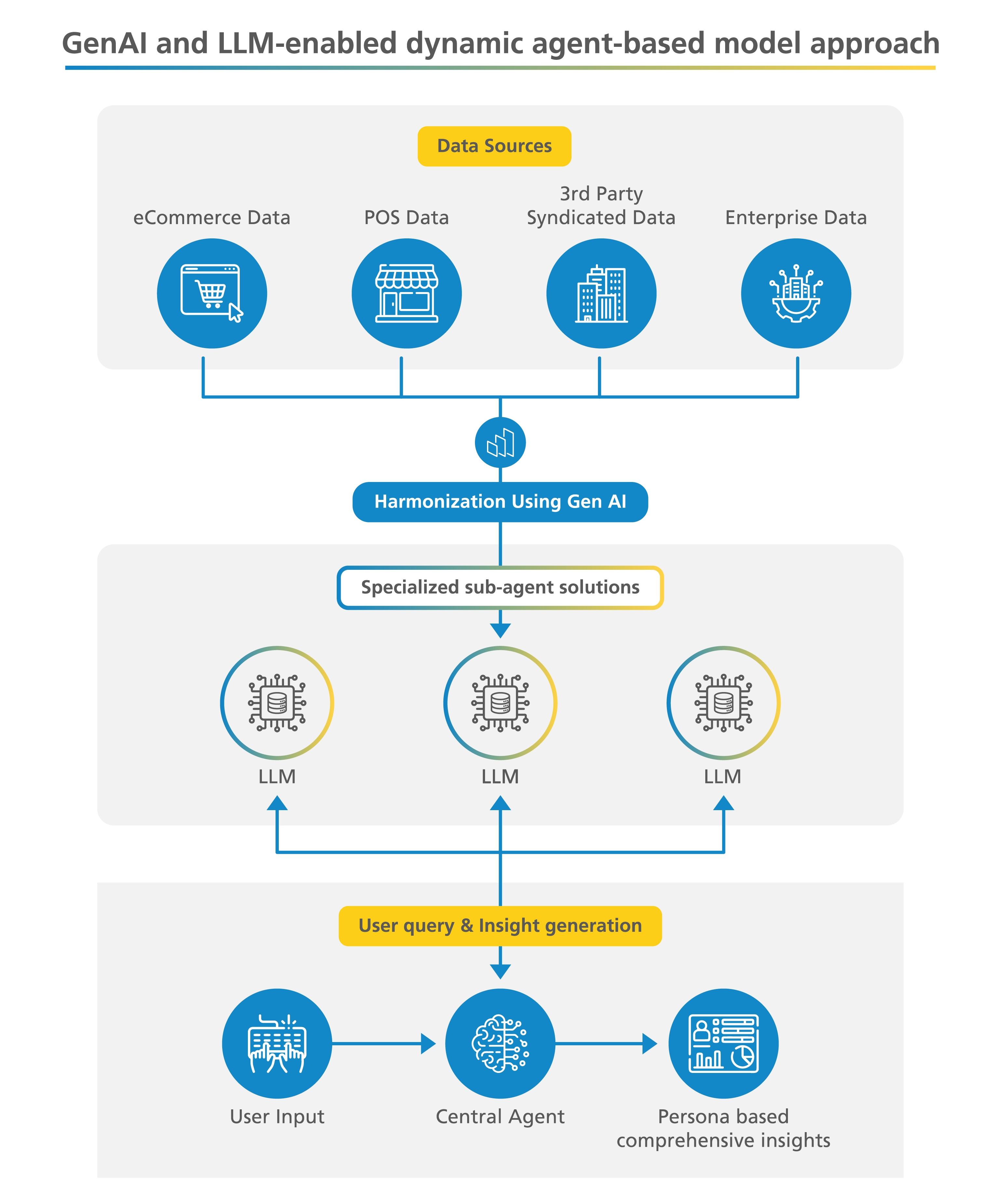 Gen AI-based solutions can utilize a dynamic agent-based model tailored for the CPG industry, involving a sophisticated multi-agent network centered around a central agent. This central agent, powered by a large language model, efficiently captures specific user requirements and breaks them down into smaller tasks assigned to specialized sub-agents. Each sub-agent, also coupled with large language model capabilities, handles different data dimensions. When a query or task is received by the central agent, these sub-agents act on connected data dimensions to create relevant outputs. The output generated by each queried sub-agent are then converged by the central agent to create meaningful insights.