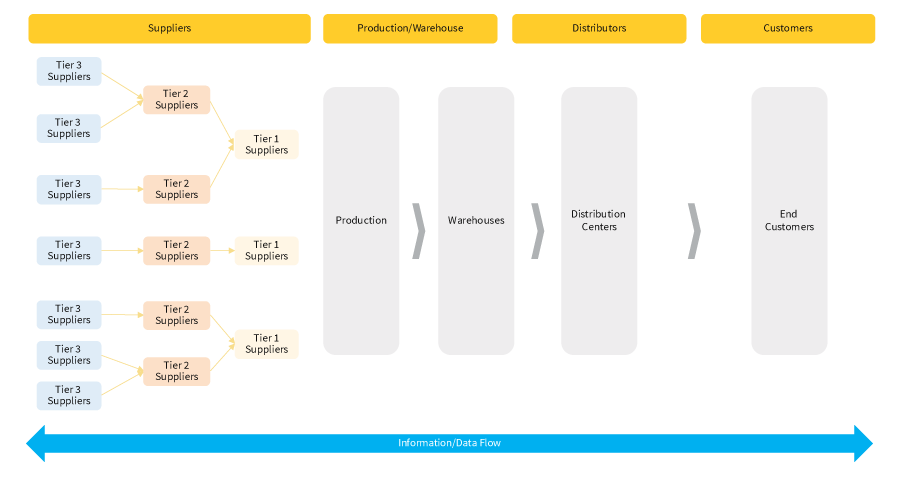 In a typical supply chain, goods move through a network of suppliers, production hubs, warehouses and distribution centers before reaching end-customers. The diagram below illustrates the flow (see figure 1). Real-time data exchange across each note is critical to ensure visibility, coordination, and timely execution, A lean supply chain focuses on selecting the right suppliers, optimizing transportation and warehousing, and applying just-in-time (JIT) practices to reduce delays, inefficiencies, and operational waste.