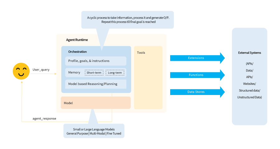Google’s agent architecture includes a feedback loop for continuous processing and external data integration, enabling autonomous decision-making. The agent architecture is made up of three key layers – model, orchestration, and tools. All three work together to enable continuous goal-seeking behaviour.- Model: Refers to any small or large language model capable of reasoning and follow any logic framework such as ReAct, Chain-of-Thought, etc. For ideal performance of the model, it should be trained on the problems you plan to solve using this agent and with the tools that will be used during this process.