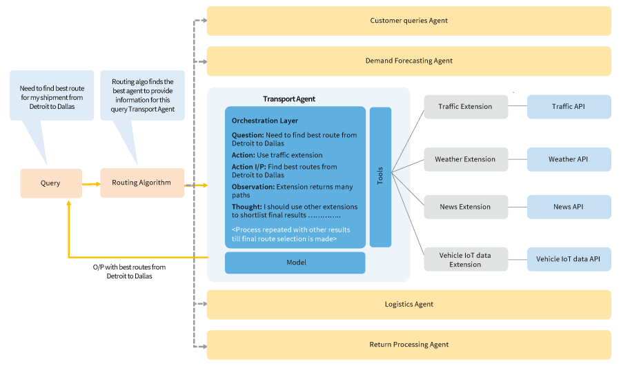 To address various supply chain issues using AI agents, business use cases should be grouped into logical categories such as customer service, demand forecasting, transportation, logistics, and return management, each category can be handled by a specialized AI agent trained on specific sample datasets. The following diagram illustrates a basic route selection problem addressed by an AI transport agent built on Google’s cognitive agent architecture (See figure 3).
