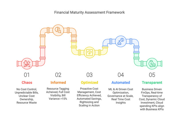 1. Assessing maturity to define the starting point Before charting the course forward, it was essential to assess the bank’s FinOps maturity. The FinOps maturity model, typically broken into three stages—Crawl, Walk, and Run, provided a starting framework. However, a more nuanced approach was needed, splitting these into five different phases to help the team better understand their progress.Through a structured assessment, the FinOps team evaluated their cloud usage from a financial perspective and identified where they stood in their journey. The results placed them between the "Chaos" and "Informed" stages—meaning that despite ongoing efforts, they risked stagnation without a deliberate strategy to shift the trajectory.