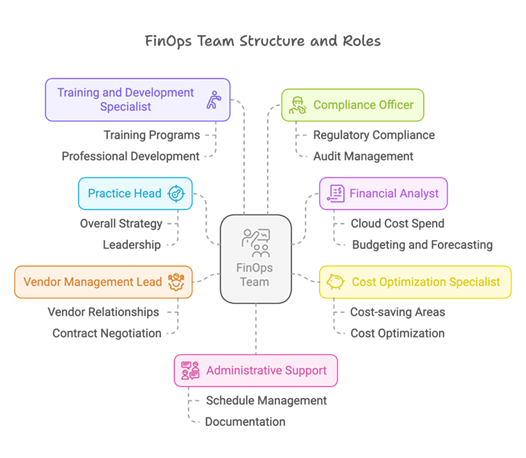 1. Establishing a structured team With a clearer picture of maturity levels, the next priority was to define roles within the FinOps practice. Given the limited personnel, many team members took on multiple responsibilities—a common scenario in growing teams. The practice head, for example, also managed vendor relationships, while a single resource handled both administrative support and training. Additionally, the bank moved forward with hiring an AWS cloud cost optimization specialist to bring dedicated expertise into the fold. The goal was to establish clear role definitions, allowing each individual to focus on specific areas without overlap. This structure not only streamlined responsibilities but also ensured accountability, making it easier to track progress and measure impact.