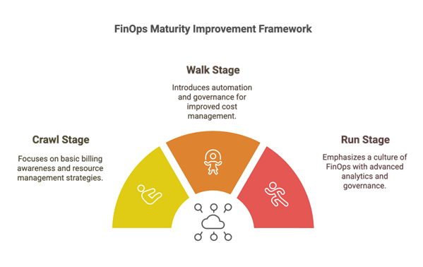 1. Advanced the FinOps journey: Crawl, Walk, Run With the foundation in place, the focus shifted to action. Using the FinOps Classic Maturity Model, a checklist was designed for each stage, ensuring a structured progression. The approach was simple: pick up chores at each step, complete them, and move to the next. A stage was considered complete when 80% of its tasks were accomplished Clear action items for each stage were as follows: Crawl Stage: establishing awareness and control