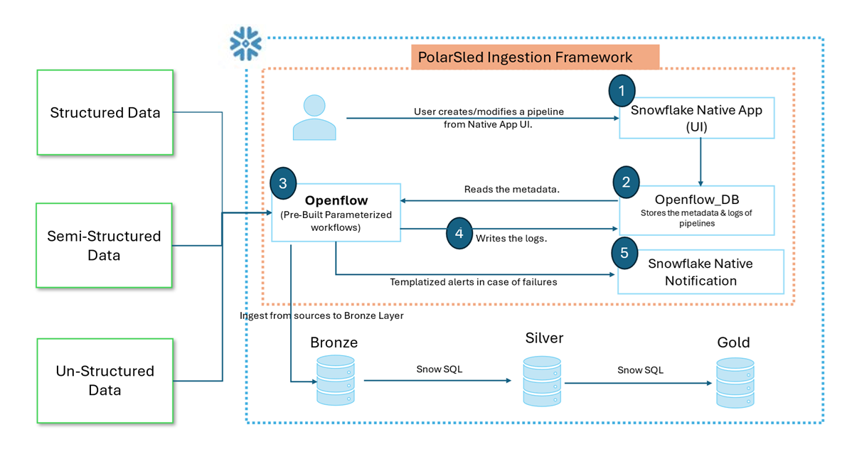 In the previous blog, you learned how Openflow simplifies AI-powered document processing by abstracting away the complexities of ingestion, parsing, chunking, and vectorization for unstructured data. In this blog, you will take a deeper dive into the technical architecture that enables this transformation at scale. I will introduce the PolarSled Ingestion Framework, a metadata-driven solution built on top of Openflow. It is designed for enterprise-grade data ingestion across all formats and incorporates built-in logging and alerting mechanisms to ensure quick detection and response to pipeline failures.