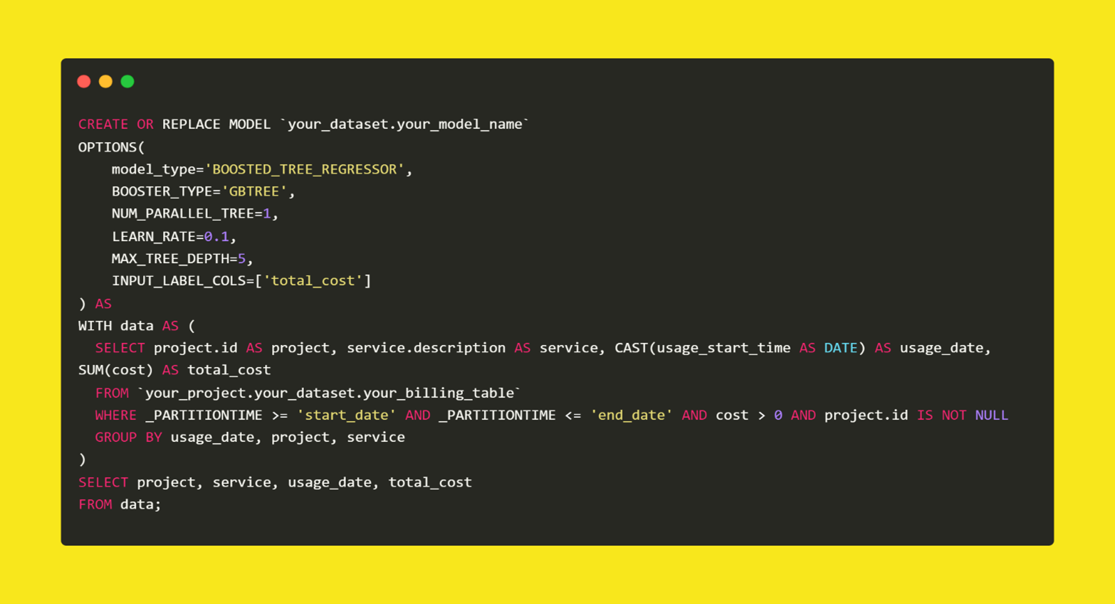 Now,let us craft our boosted tree regression model using the CREATE MODEL statement in BQML. This statement lets us specify the model type, features, target variable, and relevant parameters. The following code snippet creates a machine learning model in BigQuery to predict costs based on project details, service type, and usage date to learn from historical billing data and make accurate cost estimations.