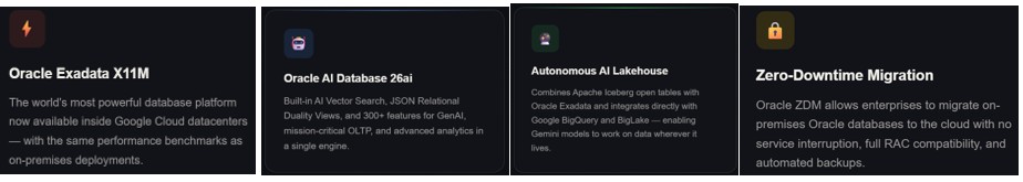 Customers can access the full suite of Oracle database services such as Oracle Exadata Database Service, Oracle Autonomous Database, and Oracle Database Zero Data Loss Autonomous Recovery Service, all managed by Oracle and billed through Google Cloud. More importantly, these services work natively with Google's data and AI ecosystem, reinforcing the value of Oracle on Google Cloud Platform in real enterprise environments.