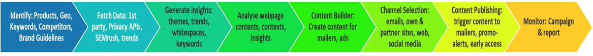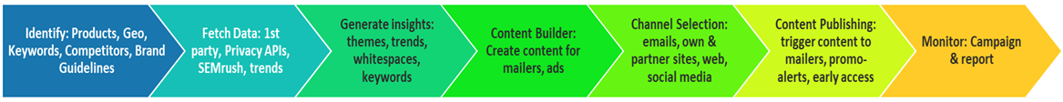 Gen AI can generate a target audience database using algorithms like LiveRamp and the Identity Resolution Engine, drawing from first party sources such as websites, product pages, partner ecommerce sites, customer data platforms (CDPs), surveys, customer feedback on the web and social media, and hyperlocal market intelligence. Gen AI can then select the most appropriate templates based on users' demographic, geographic, and linguistic preferences, and trigger personalized campaigns through direct mailers, promotions, early accesses via partner ecommerce sites, and web and social media platforms. It will also recommend updates to the product page content according to geographic user preferences.