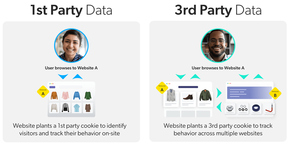 - First party cookies Collected by websites or portals for users visiting them, first-party cookies capture and store login information, preferences, searches within the site, items in cart, and checkout information.