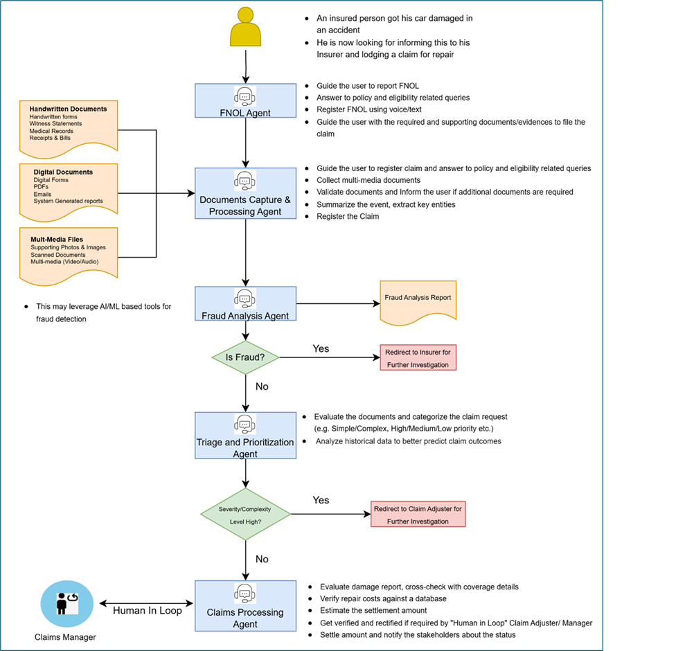 As seen in the above diagram, the FNOL agent collects incident details and initiates digital claims, validating input automatically. The document capture and processing agent captures, extracts, validates, and stores data from various formats, learns document types, and flags missing items. The fraud analysis agent applies rule-based and ML models to detect anomalies, updating logic continuously and routing claims accordingly. The triage agent assesses complexity and urgency, adjusts criteria based on trends, and escalates high-impact cases. The claims processing agent confirms coverage, calculates settlements, prepares offers, and optimizes decisions for fairness and speed, validating with adjusters before notifying stakeholders. Each agent exhibits autonomous, adaptive behaviour throughout the process. To embark on this journey of building an agentic AI solution for claims processing, Insurers need to begin with pilot use cases, define agent roles (e.g., FNOL, fraud detection), and scale iteratively with a focus on transparency, adaptability, and customer-centric outcomes. Platforms are also available that can help Insurers jumpstart by leveraging purpose-built agents and custom-built platforms. LTM's BlueVerse is one such platform that converts enterprise AI strategies into measurable outcomes. It replaces fragmented initiatives with a unified, scalable system that integrates intelligent automation and domain expertise. It is powered by the industrial-grade BlueVerse Foundry and a marketplace of 300+ reusable agents. Some examples of pre-built agents which can be useful in building an insurance claims management agentic solution are FNOL agents, and insurance claim document validation agents, coverage verification agents, claims status trackers, and insurance process digital acceleration.Benefits of agentic AI in insurance claim processing