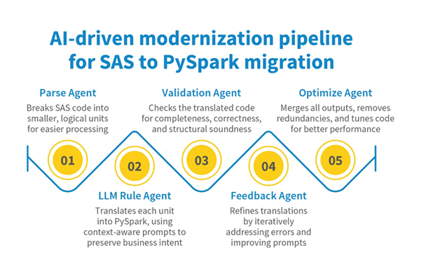 - A Parse agent breaks SAS code into manageable segments and creates an intermediate representation.