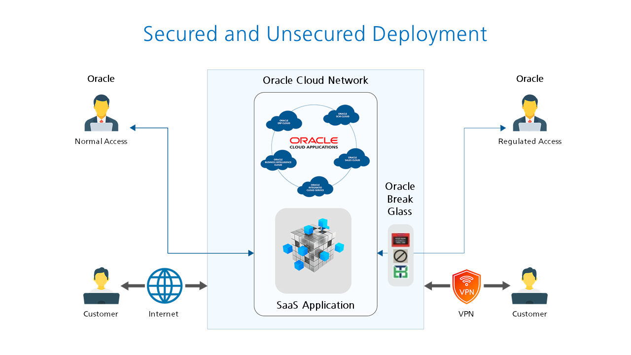 Providing access to a SaaS environment with a secure VPN/FastConnect path eliminates the risk of data flow over the internet. Second, using Oracle Break Glass, one can regulate the access to the Oracle application that manages the SaaS deployment. Besides regulation, it provides secure management by auditing the operations.