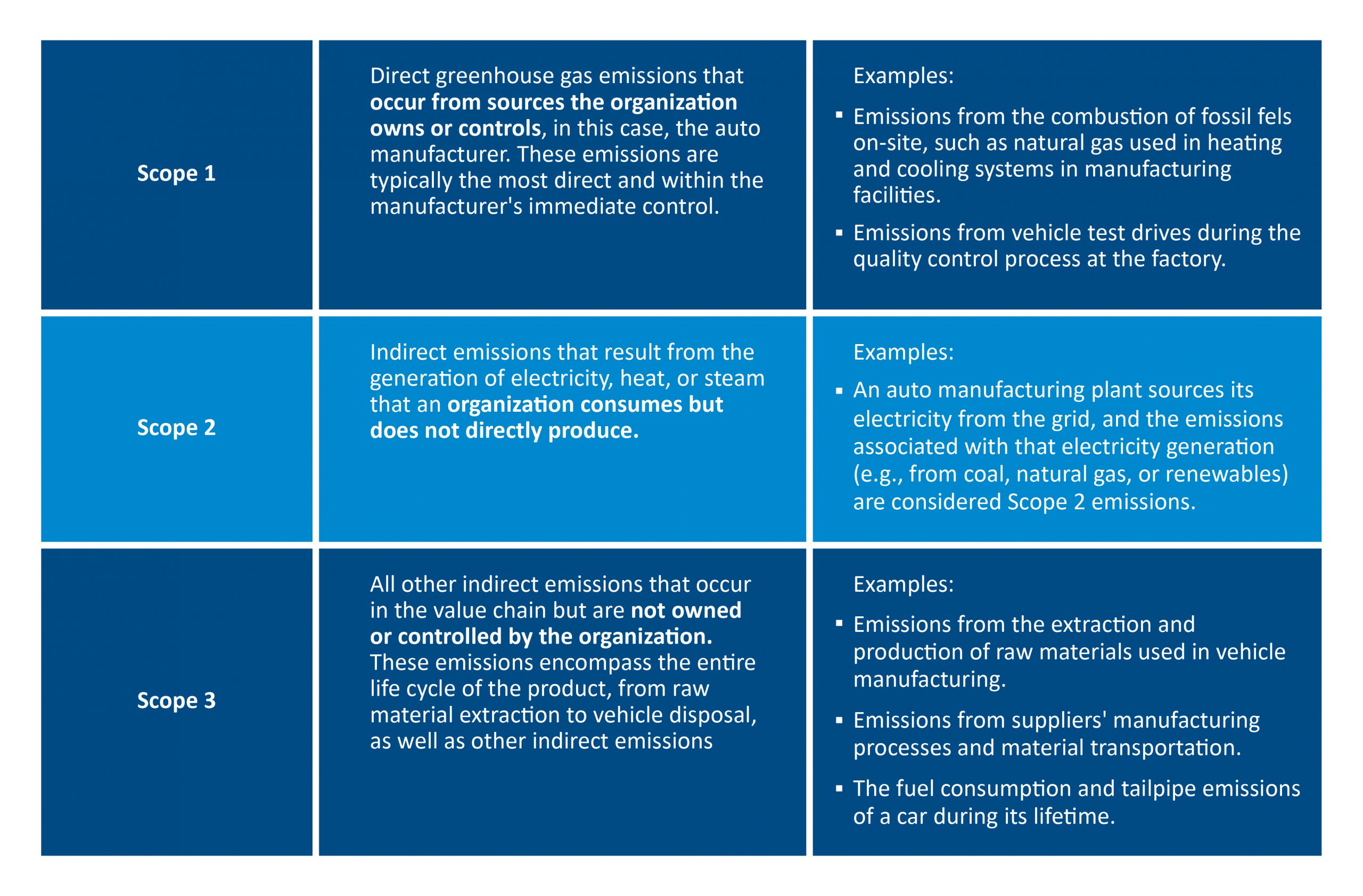 By assessing and mitigating emissions across all three scopes, manufacturers can implement more sustainable practices throughout the entire auto production and usage value chain.