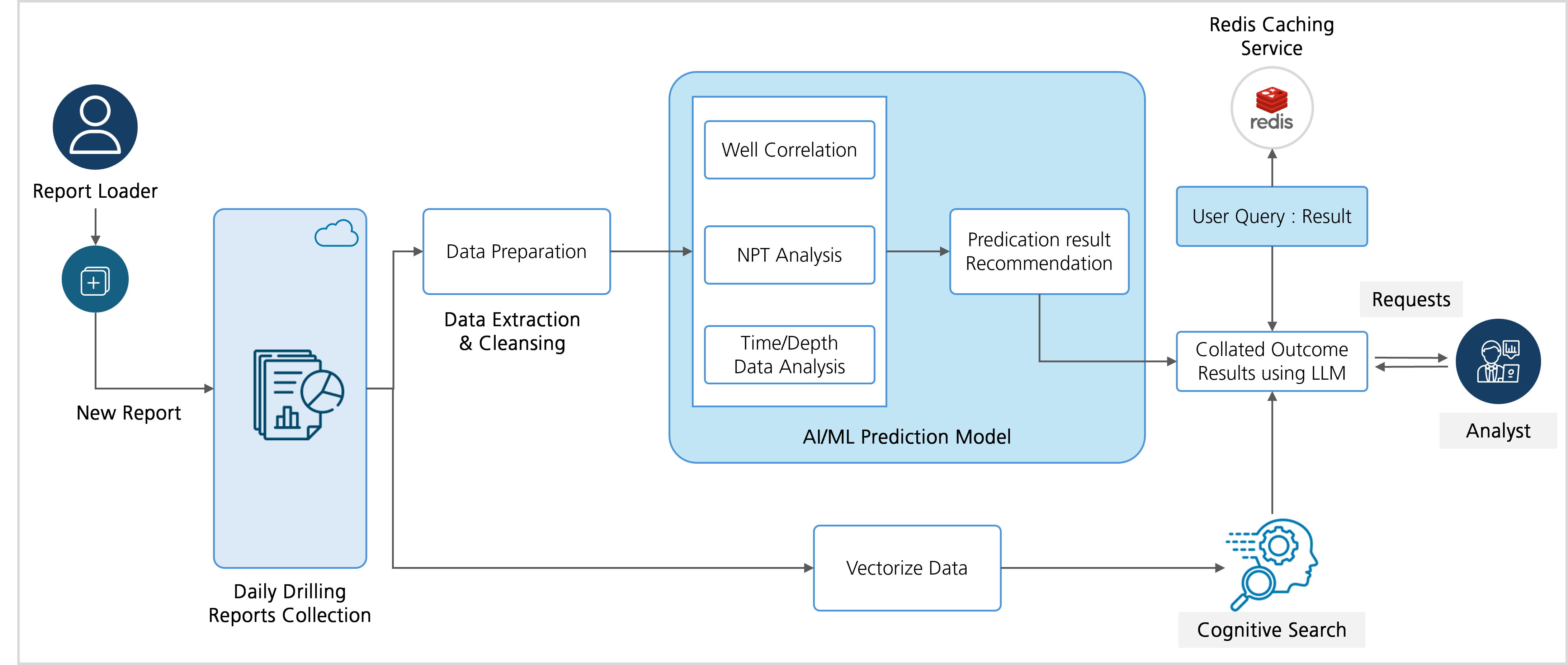 The workflow begins with collecting DDRs from the area of interest. These reports undergo a data preparation phase to ensure accuracy and readiness for analysis. Well correlation follows, identifying patterns across historical data. The next critical step is extracting relevant risk information from drilling event descriptions in the reports. Gen AI models, especially those using retrieval-augmented generation (RAG), help improve data quality by automating insight extraction. Engineers can interact with a cognitive search interface to query specific results. These are processed using an LLM, which generates detailed outcomes. While commercial models like ChatGPT work well for common events, fine-tuning is needed to capture rare drilling classes. A caching service such as Redis ensures faster response times by storing frequently accessed queries. AI/ML models trained on historical data help establish correlations and assist in drilling planning. This leads to faster, more accurate recommendations for drilling engineers, enhancing safety, reducing risk, and optimizing drilling operations. The conceptual workflow described above is shown below.
