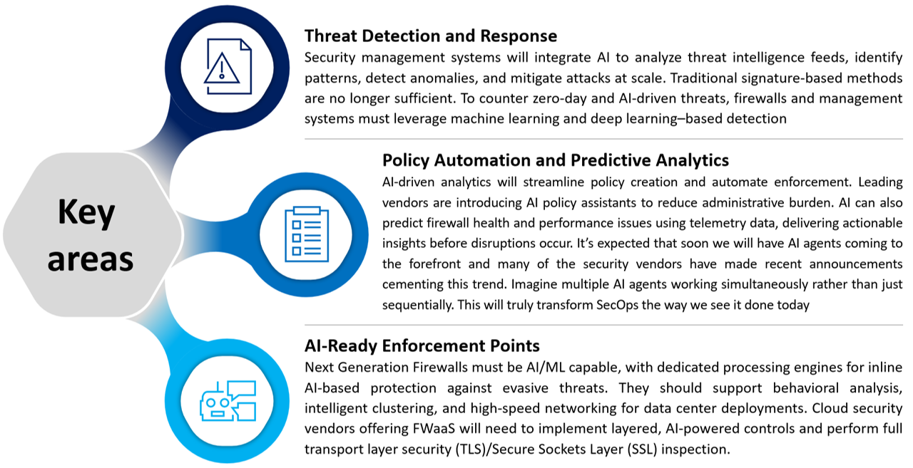 If SSE is so effective, why do hardware firewalls still exist? They remain essential for enterprises with on-premises data centers, securing east–west traffic, VPN termination, or when cloud security introduces unacceptable latency. Looking ahead, the firewall will evolve beyond its traditional definition as a hardware appliance or Firewall-as-a-Service (FWaaS). It will become a distributed function across the network, decoupled from any single appliance or SSE solution. As attack surfaces expand, organizations will adopt distributed firewall architectures with centralized policy engines and diverse enforcement points which could be hardware appliances, virtual appliances, and cloud services. You won’t find a silver bullet solution for enforcement points. However, there will be a shift towards consolidation in policy administration through centralized policy engines. This approach will simplify provisioning and streamline management across various enforcement points, effectively protecting multiple perimeters.AI: The game-changer in cybersecurity
