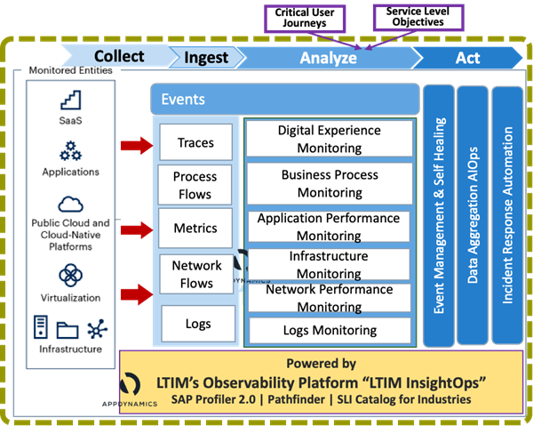 LTM's InsightOps solution provides full-stack observability of any solution, irrespective of underlying technologies. The reimagined single pane of glass observability solution is engineered on best-of-breed stacks enriched by Cisco's AppDynamics observability cloud solution. The solution comes with pre-built Service Level Indicators (SLIs) libraries for end-to-end business processes for various industries.