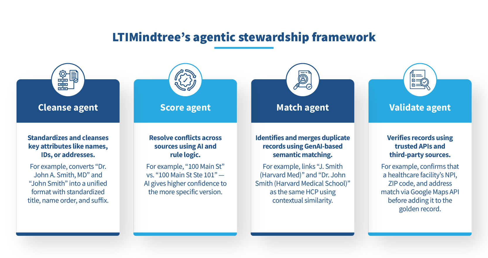 That’s why LTM developed Agentic Stewardship, a GenAI-powered framework where intelligent agents handle the tasks traditionally managed by human stewards. These agents bring real-time accuracy, context, and learning into every step of the MDM process. Our core agents include the following.