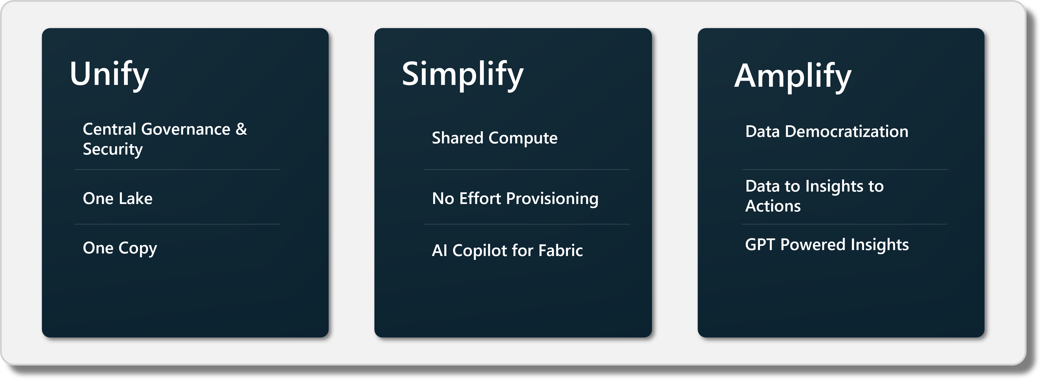 Although there's no one-size-fits-all solution to addressing intricate challenges, Microsoft's latest data offering, Microsoft Fabric, promises to address these challenges. The underlying principle of the Fabric platform is to provide a unified solution that combines data extraction and transformation, visualization, and machine learning products, all while offering centralized governance and identity management through Microsoft Purview.