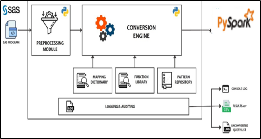 The logging and audit module creates process and exception logs during conversion and generates a log file listing encountered exceptions. At the end of the conversion, it produces four files: a converted PySpark file, a converted PySpark notebook file, a results file summarizing conversion details for each SAS input file, and a lineage summary that includes Metadata of the source and target system data objects referred to in a SAS Code.