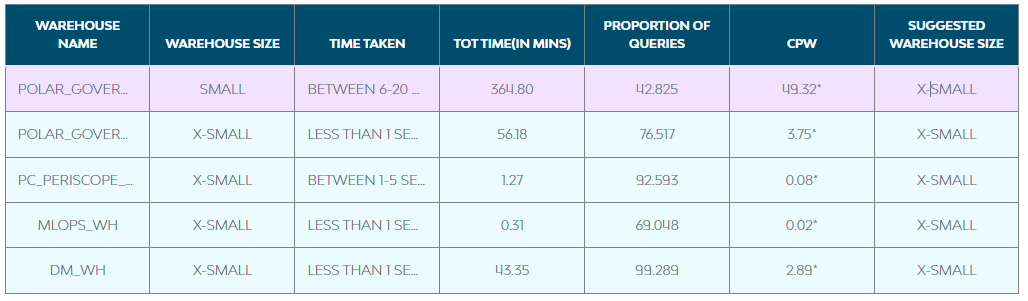 - FinOps has an optimizer dashboard that the user can filter based on the warehouse and specific duration, identify the workloads contributing to the higher load, and move higher loads to different warehouses. This can assist you in correctly separating into warehouses by recognizing workload information, such as tables, to leverage caching under the same department or application.