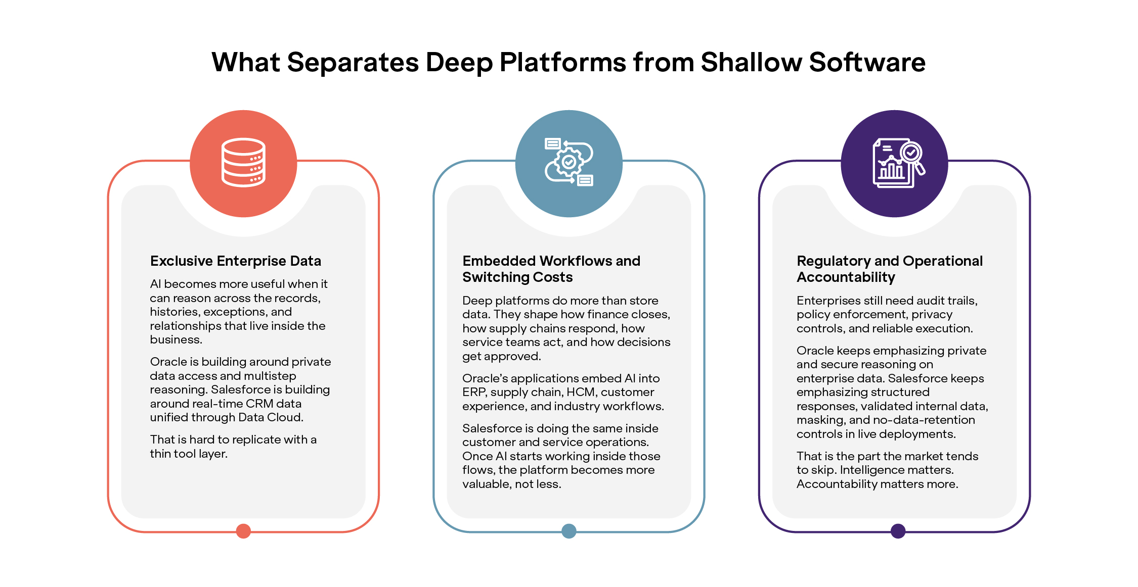 I do not hear clients asking how to rip out Oracle and replace it with a layer of agents or point tools. Serious enterprises know what sits beneath those platforms: controls, policies, auditability, and institutional memory. That is why I see AI as a platform multiplier, not a platform replacement. The real divide is not SaaS versus AI. It is shallow software versus deep platforms.