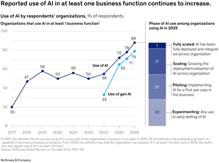 McKinsey’s ‘The state of AI’ report shows 88% of organizations use AI in at least one business function, up from 78% last year; Gen AI adoption rose to 79% from 71%.