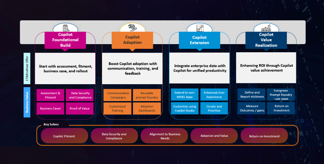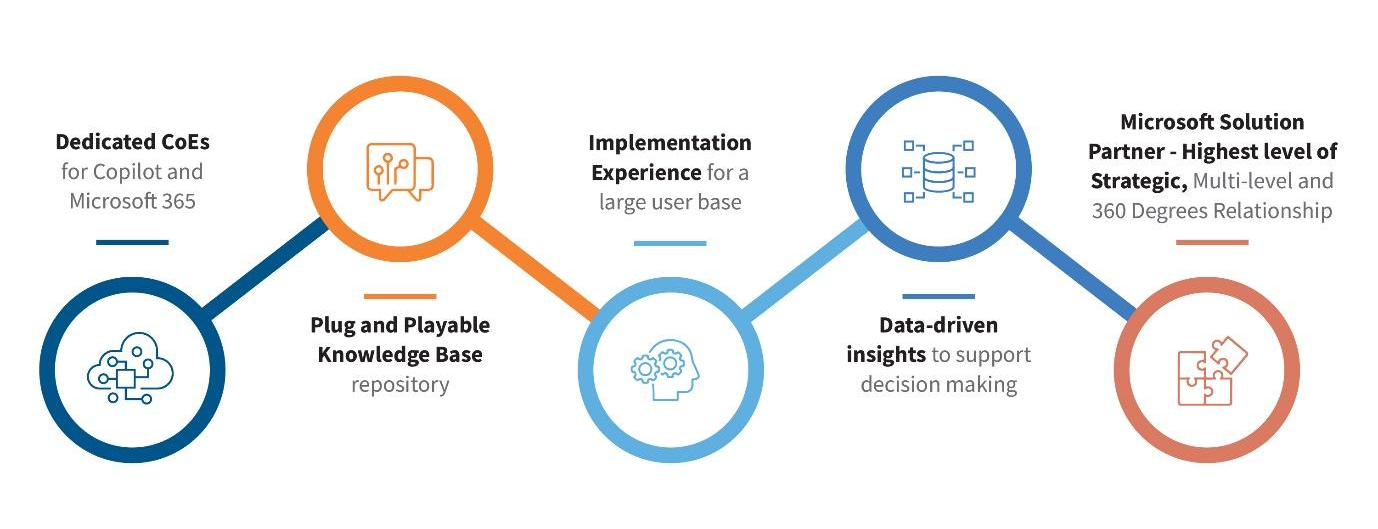Leveraging extensive experience with internal and customers implementations, LTM follows a structured five-phase execution approach to ensure a successful Copilot rollout. This approach includes: